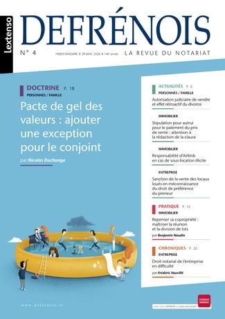 Chaque semaine (depuis le lancement de la nouvelle formule Hebdo le 7 septembre 2017), le Defrénois décrypte pour les professionnels du notariat les dernières évolutions législatives et jurisprudentielles dans tous leurs grands domaines d’expertise : ACTES COURANTS/IMMOBILIER - FAMILLE/PATRIMOINE - ENTREPRISE - FISCAL - PROFESSION - RURAL. À la fois revue d’information et revue scientifique de réflexion et d’imagination, le Defrénois a été repensé pour simplifier leur quotidien : appliquer de nouvelles règles et adopter de nouvelles pratiques dans de nouveaux contextes sociétaux.