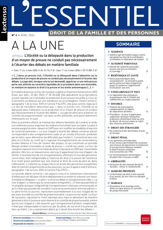 « (…) en cas de survenance d’un fait nouveau, la cour d’appel, saisie d’une instance en divorce, a le pouvoir de modifier ou de supprimer une mesure provisoire. » Cass. 1re civ., F, 4 mars 2026,...